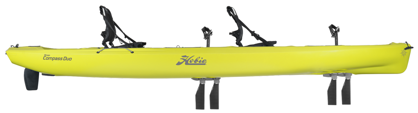 Mirage Compass Duo jest zasilany przez dwa napędy MirageDrive z podnoszonymi płetwami, które chowają się po uderzeniu. Wyposażony w MirageDrive 180 i MirageDrive z technologią Glide, Duo zapewnia płynną i wydajną jazdę dla dwojga zarówno do przodu, jak i do tyłu. Smukła konstrukcja kadłuba Duo maksymalizuje prędkość i stabilność, jednocześnie znacznie zmniejszając opór. Kokpit wyposażony jest w wygodne, ergonomiczne siedzenia, 4 zintegrowane szyny H do montażu akcesoriów oraz liczne schowki nad i pod pokładem, w których można przechowywać sprzęt dla dwóch osób. Elegancka linia wodna i system Kick-Up Rudder tworzą imponująco zwinny kajak tandem, który jest bardzo responsywny, łatwy w sterowaniu i niezwykle wytrzymały. Pojemny Compass Duo jest prosty w obsłudze i gotowy na przygodę, dzięki czemu jest idealnym wyborem na wycieczki do wody z dorosłymi, na rowerach i futrzanymi towarzyszami.